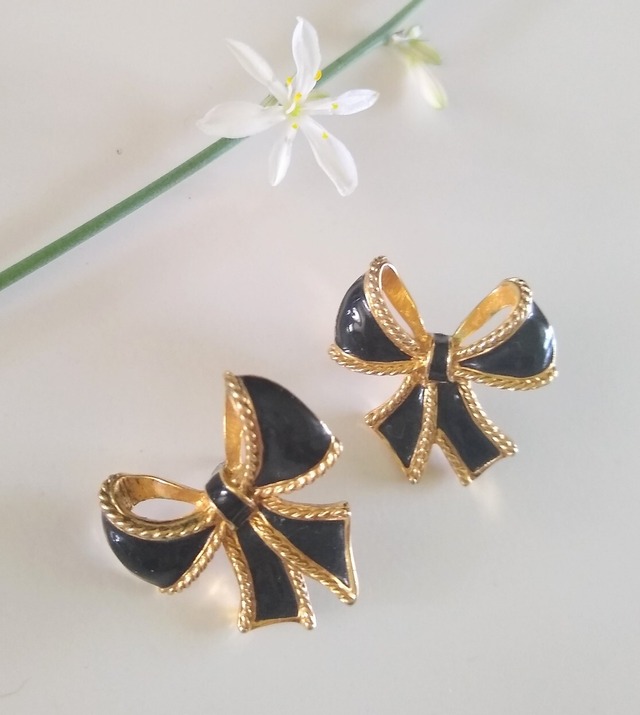 イエローゴールドカラーメタルをベースに艶々のブラックエナメルのリボンが大人かわいい ケネスジェイレーンのヴィンテージピアス。 とっても素敵なデザインです。 裏側のスタッド部分にメタル変色が少しありますが、その他はとても綺麗なコンディション。 スタッド部分は、アルコール消毒してお届けします。 サイズ:約2.8cmx2.8cm サイズ:約2.7cmx1.7cm