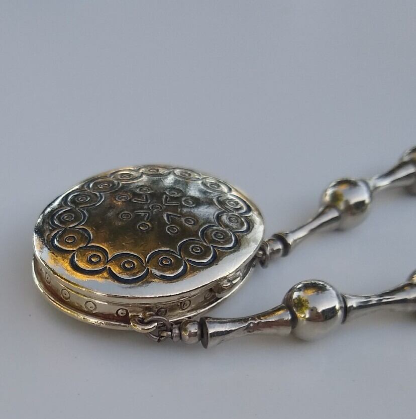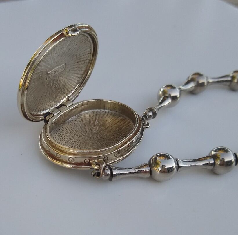 シルバーカラーメタルをベースに少し大ぶりなデザインのヴィンテージロケットペンダントネックレス。ロケットの両サイドにデザインの彫りが入っています。