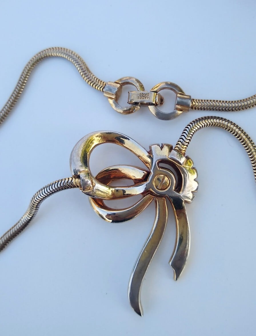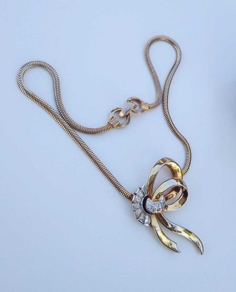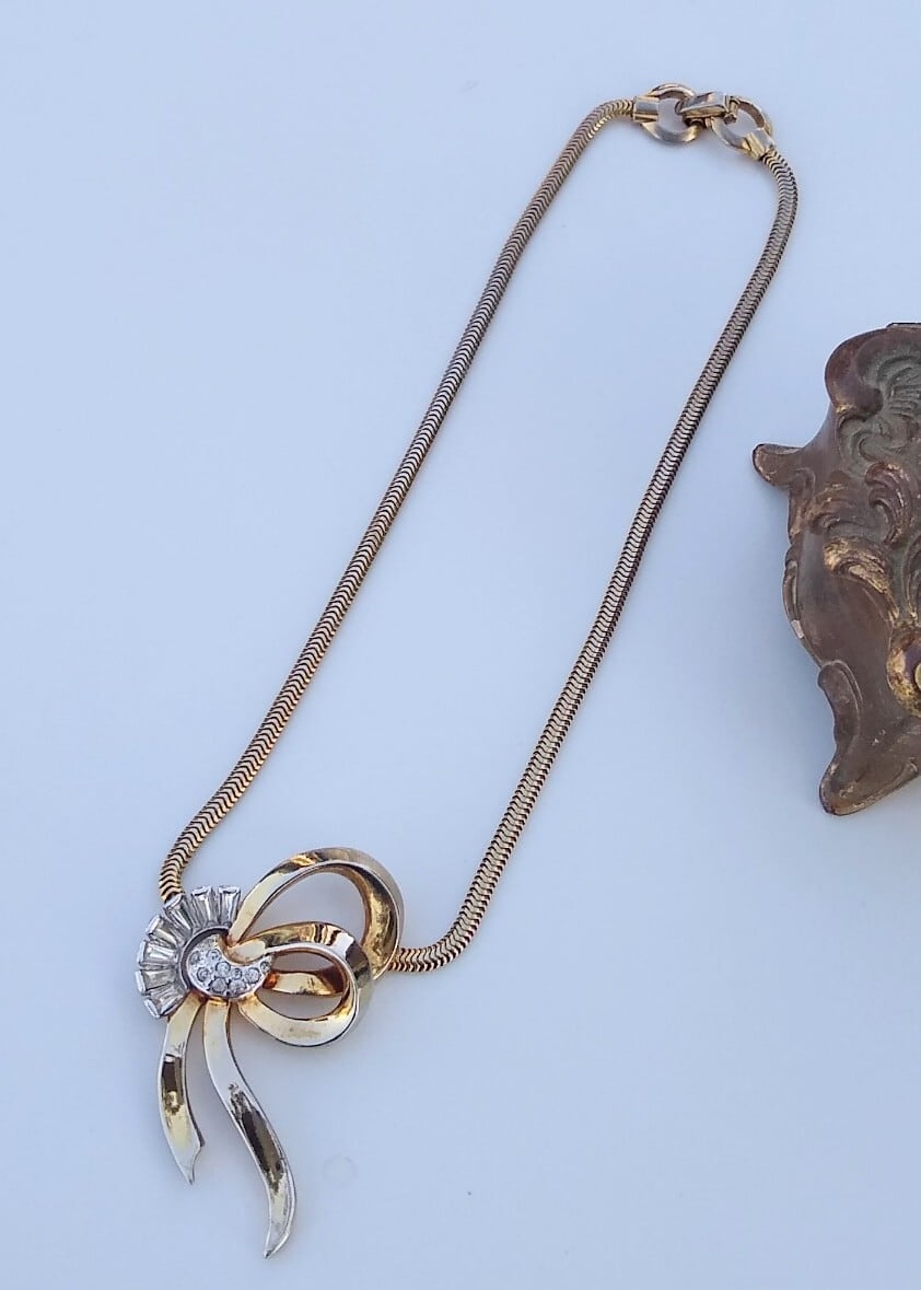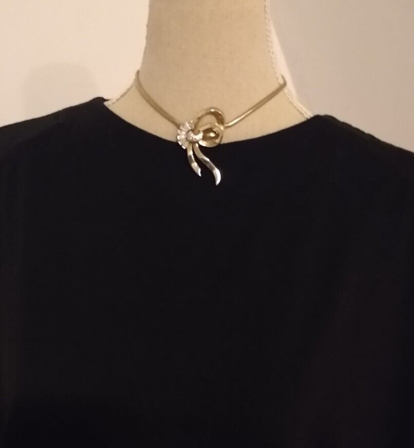 ゴールドカラーメタルをベースに重厚なリボンモチーフのペンダントトップはラインストーンで丁寧に飾られ、とても丁寧に精巧に作られているメイザーブラザーズのヴィンテージチョーカーネックレス。