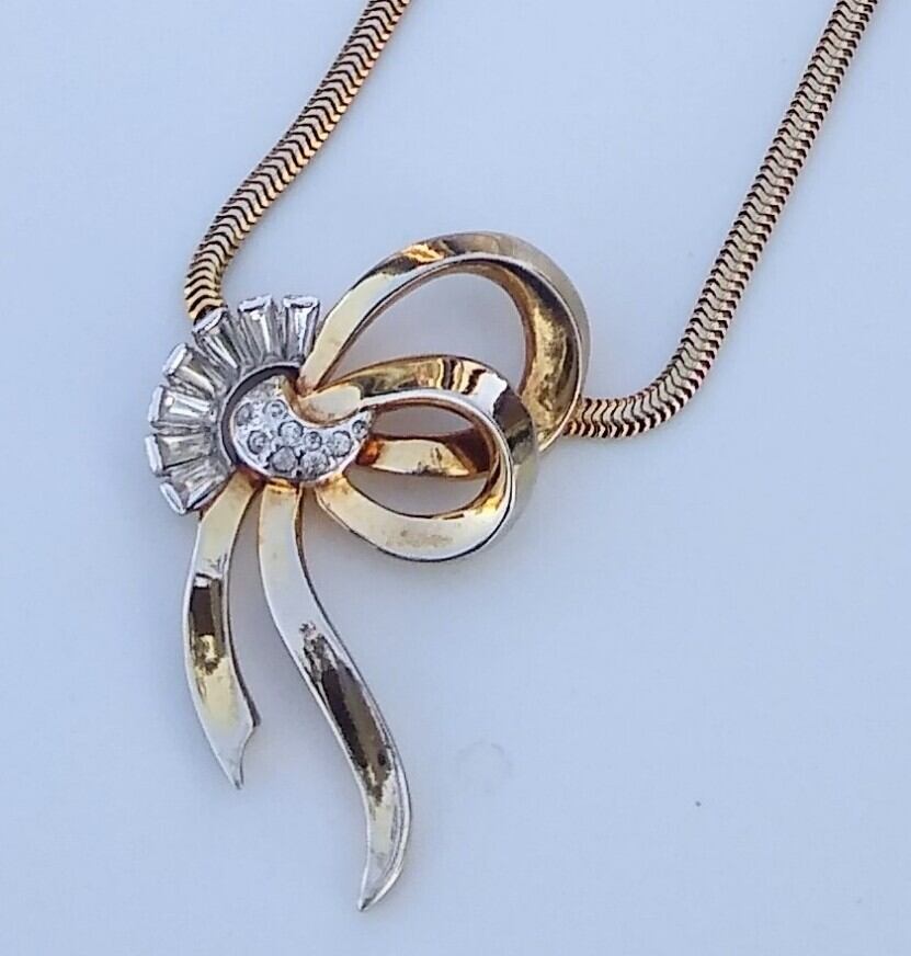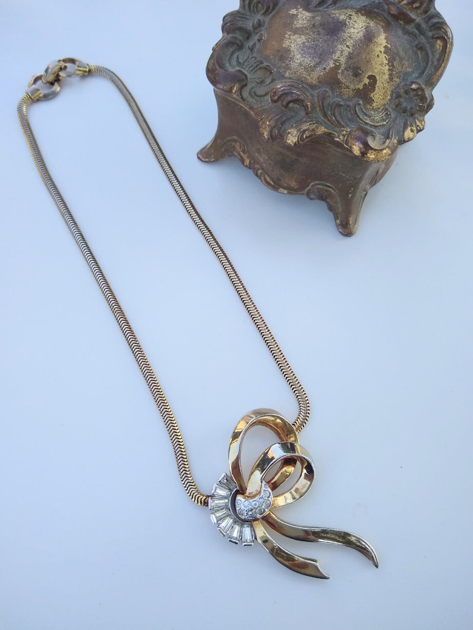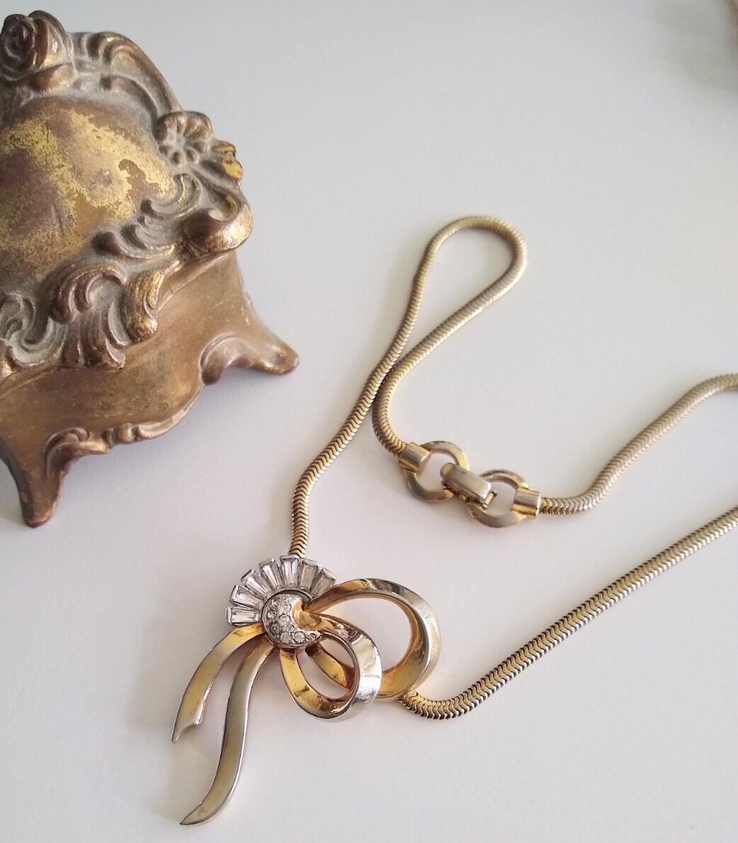 ゴールドカラーメタルをベースに重厚なリボンモチーフのペンダントトップはラインストーンで丁寧に飾られ、とても丁寧に精巧に作られているメイザーブラザーズのヴィンテージチョーカーネックレス。