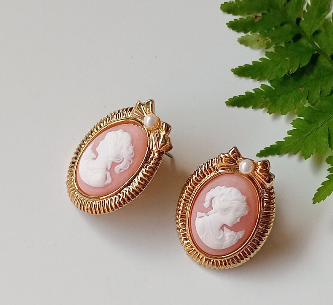 イエローゴールドカラーメタルを枠に、優しい色の女性のカメオがはめ込まれたロマンチックなヴィンテージピアス。