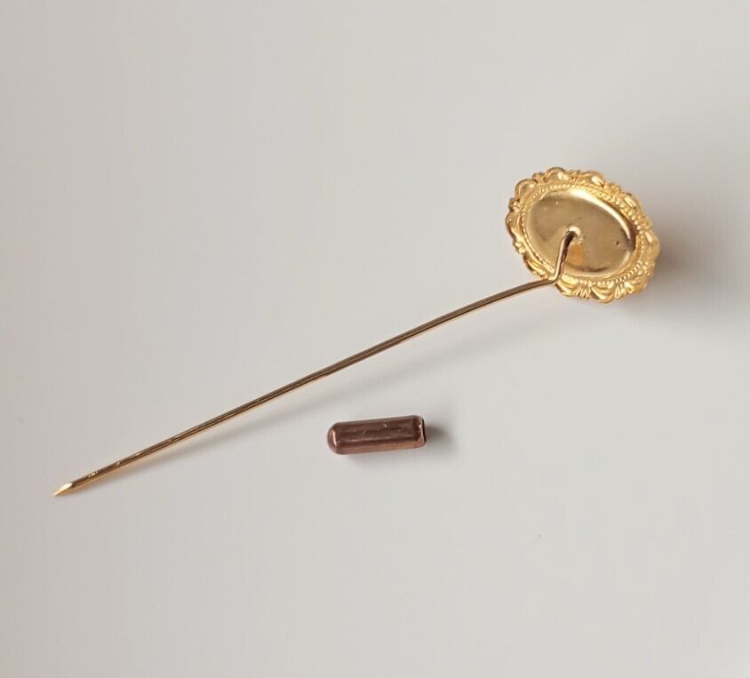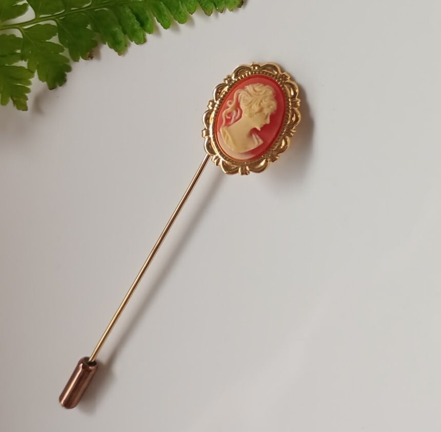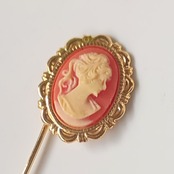 イエロー湖ーカラーメタルをベースにエレガントな枠におさめられた樹脂製カメオカボションが素敵なヴィンテージハットピン。