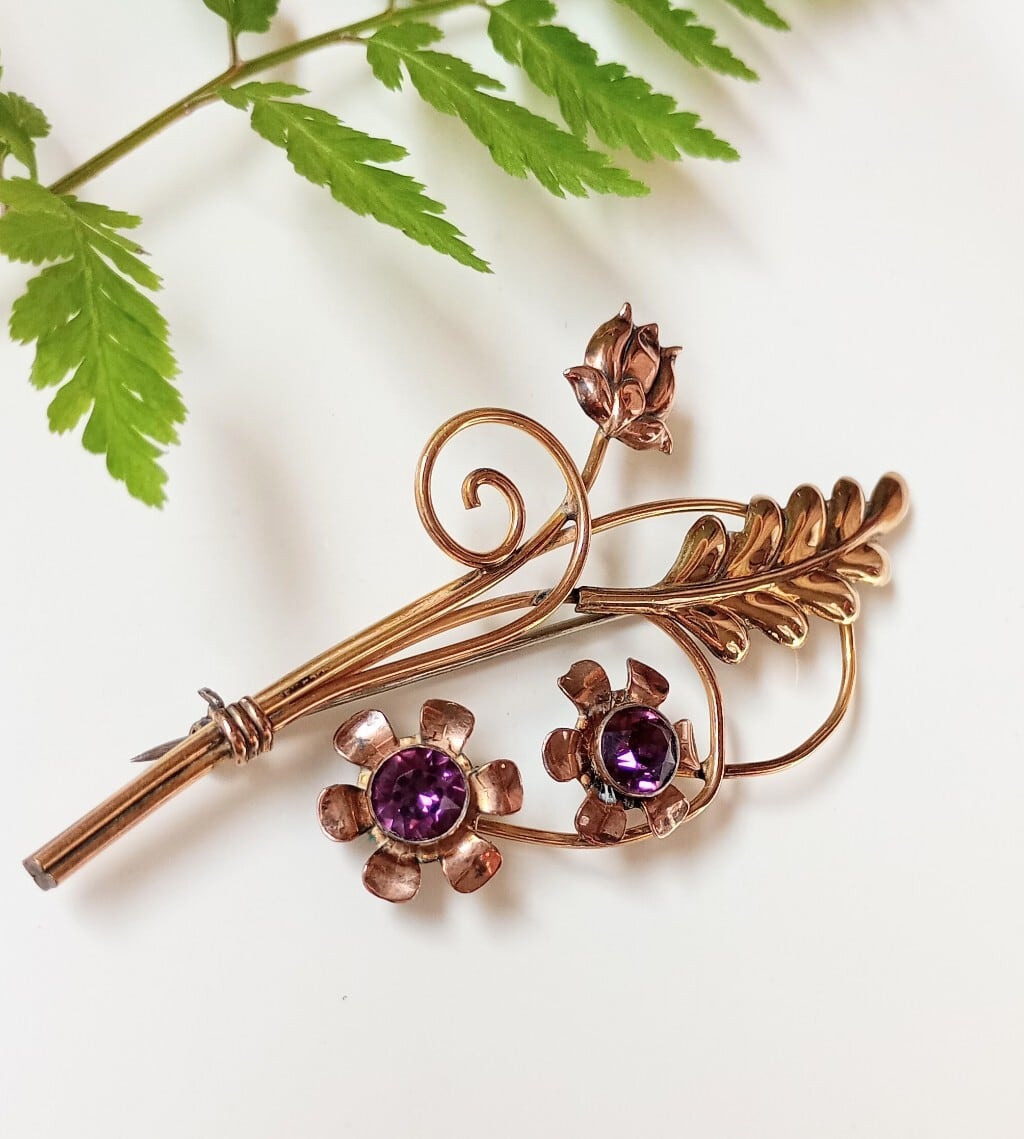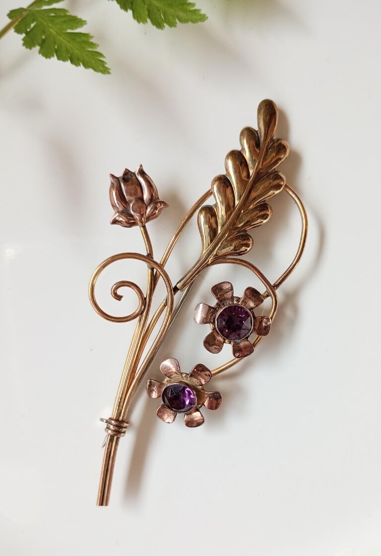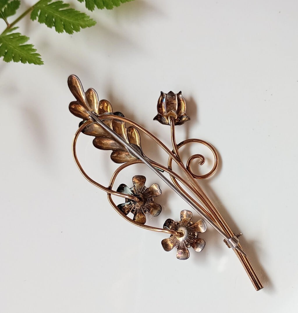 曲線を描いて流れるような優しいラインがエレガントなヴィンテージブローチ。金張りはイエローゴールドが主ですが、蕾の部分はピンクがかったゴールドですので12Kローズゴールドが使われていると思われます。
