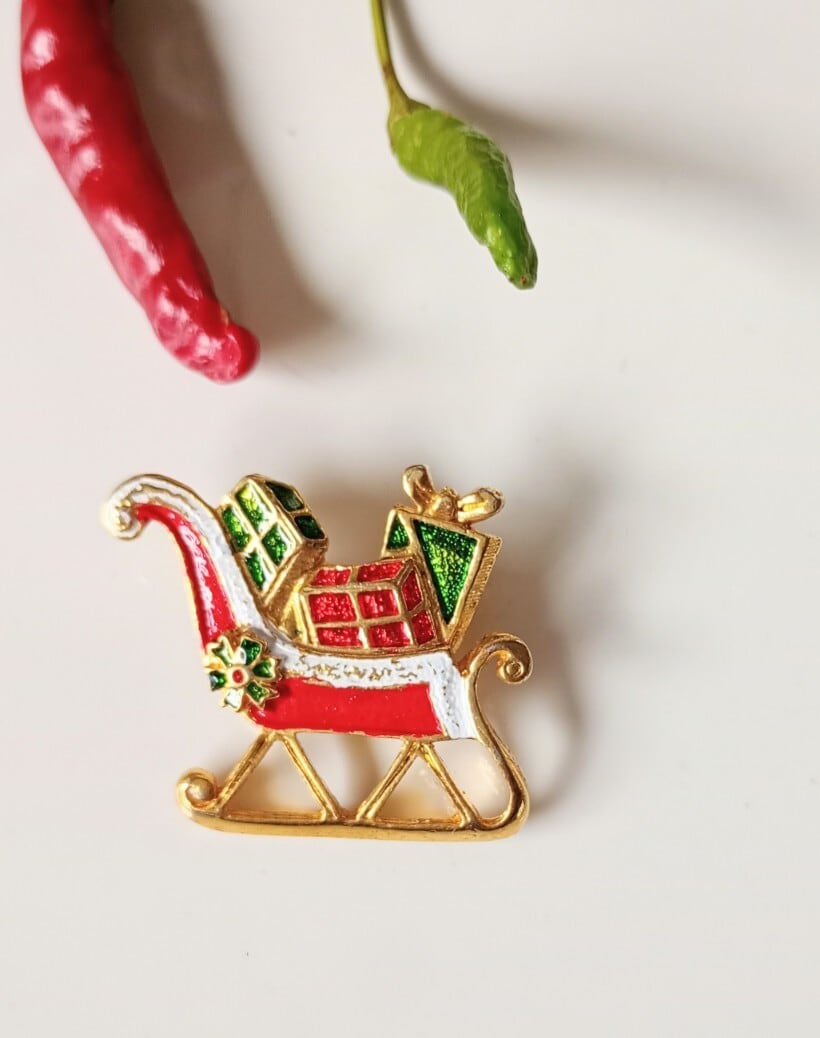 イエローゴールドカラーメタルをベースにカラフルなお色が楽しい小さなヴィンテージクリスマスブローチ。