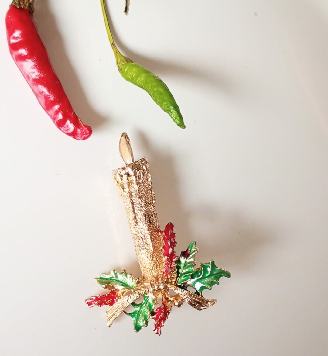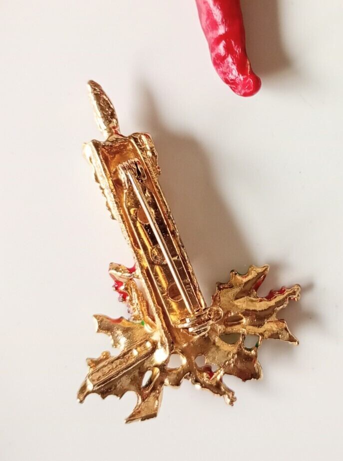 イエローゴールドカラーメタルをベースに柊が飾られたろうそくのヴィンテージクリスマスブローチ。