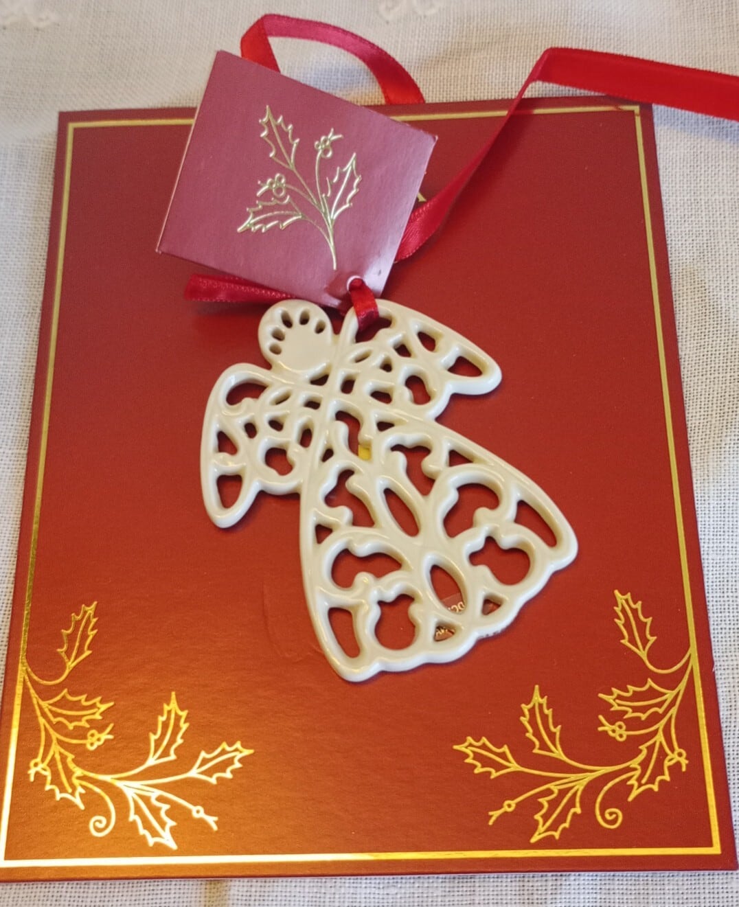 アイボリー色の陶器製天使のクリスマスツリーオーナメント。