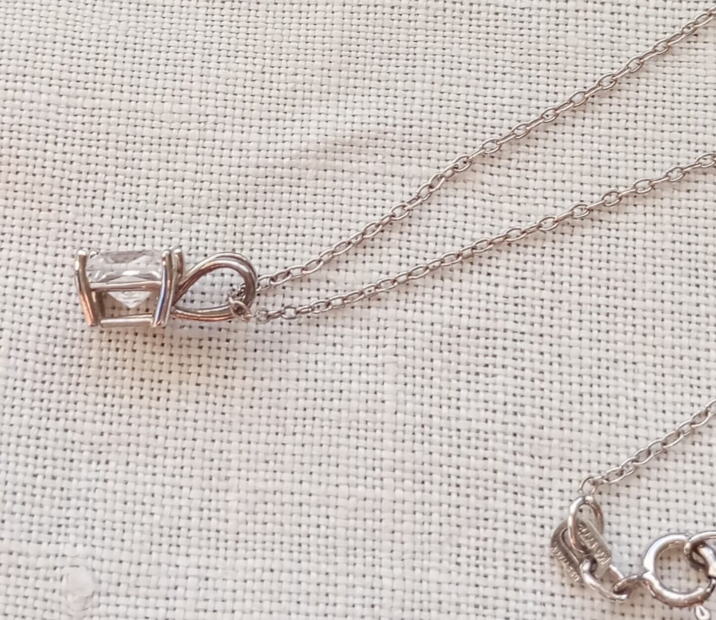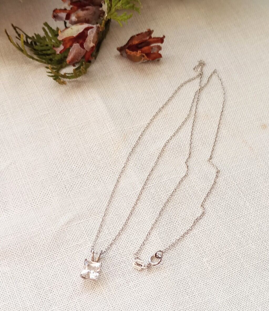 スターリングシルバーをベースにスクエアカットのホワイトサファイアのペンダントがシンプルで素敵なネックレス。