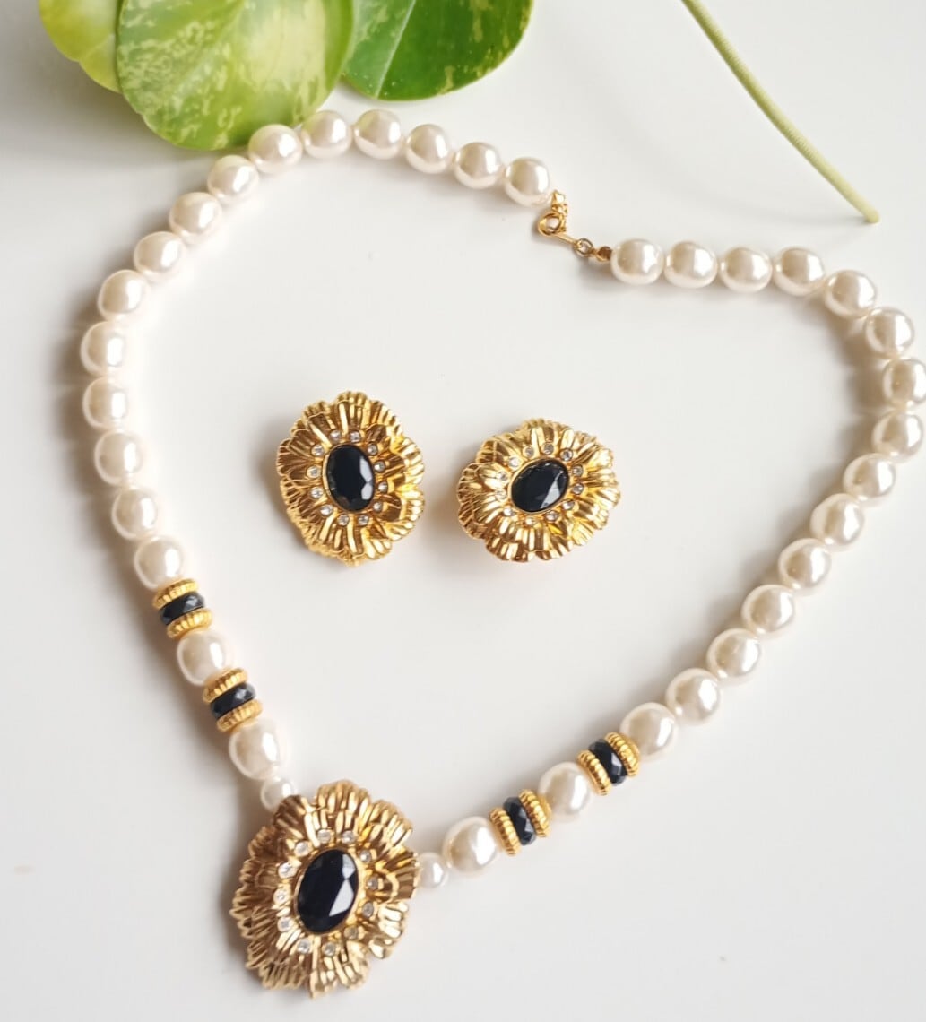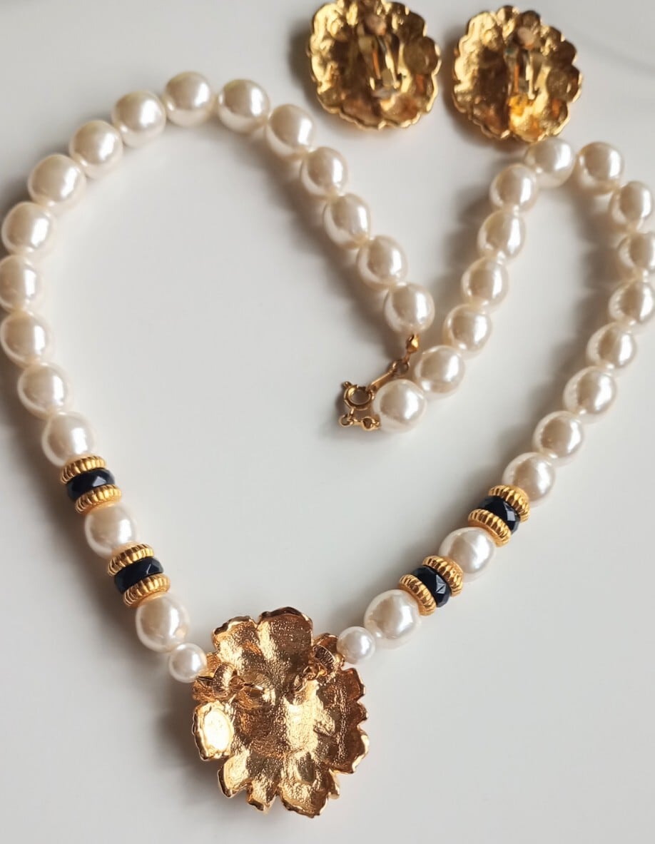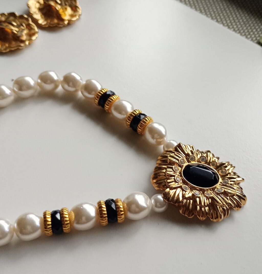 フェイクパールとオニキス、ゴールドが映えるケネスジェイレーンらしいゴージャスでエレガントなデザインのヴィンテージネックレスとイヤリングのセット。