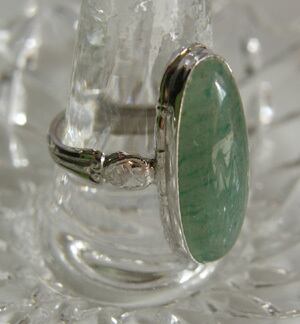 スターリングシルバー製のリングに細長い薄緑色のアベンチュリンのストーンが施されたヴィンテージリング。