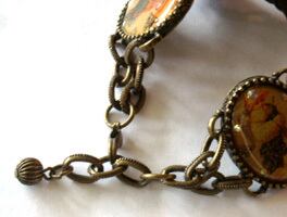 アンティーク感のあるブラスチェーン、ビクトリア風のクリスマスの絵柄をガラスで閉じ込めたピースを繋げたリンクブレスレット。