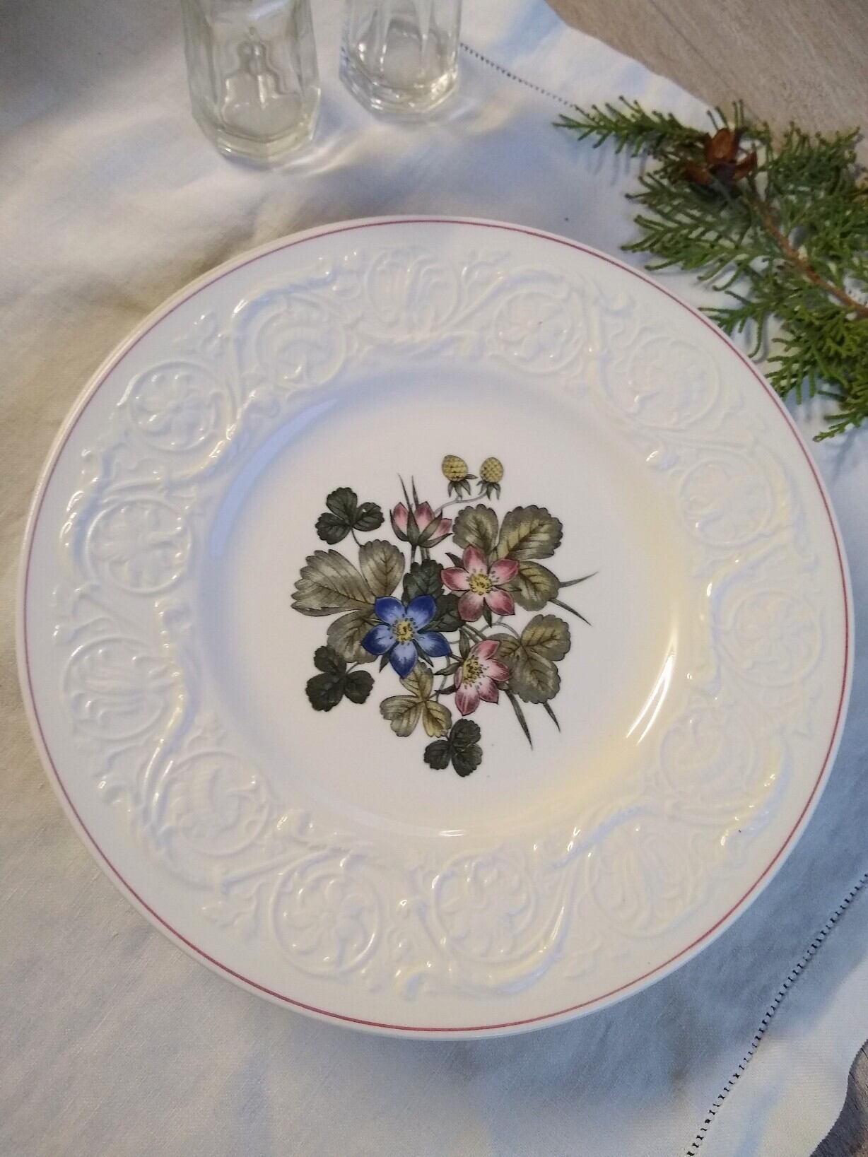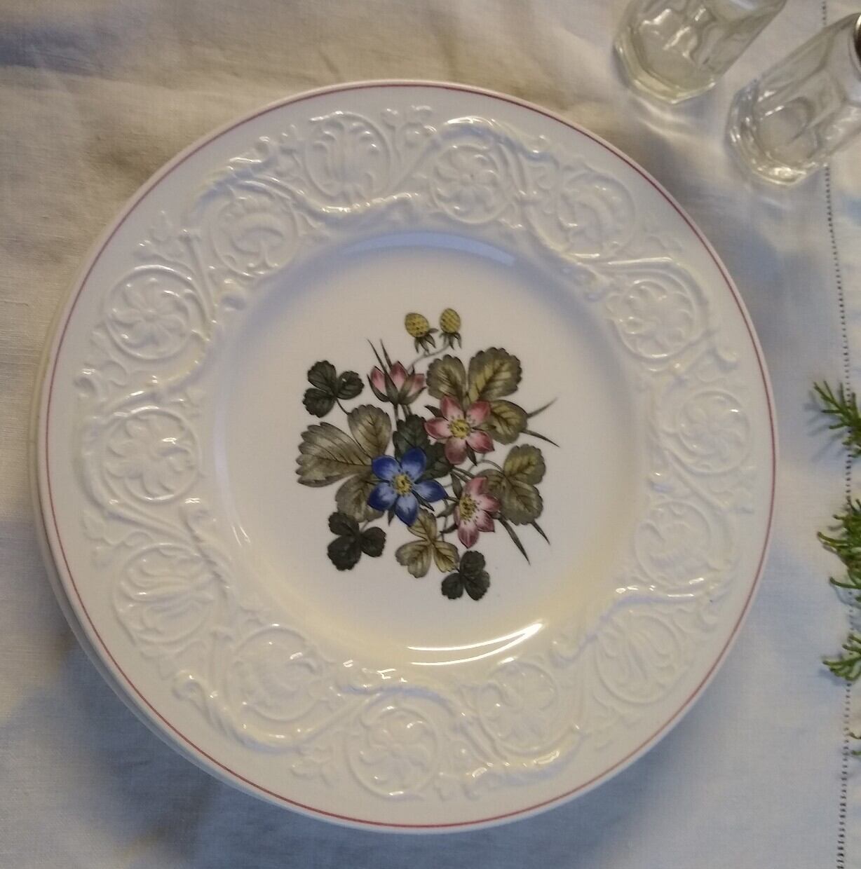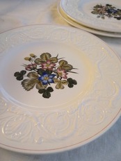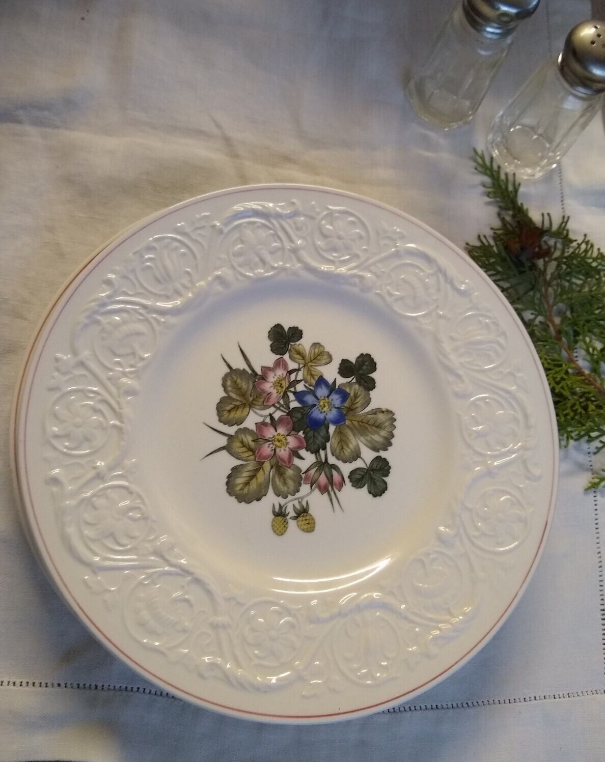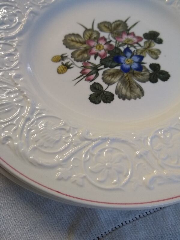 お花や木の実の可愛らしい絵柄が中央に、そして周りはエレガントなエンボスが囲みます。素敵なデザインのウェッジウッドのサラダプレートです。