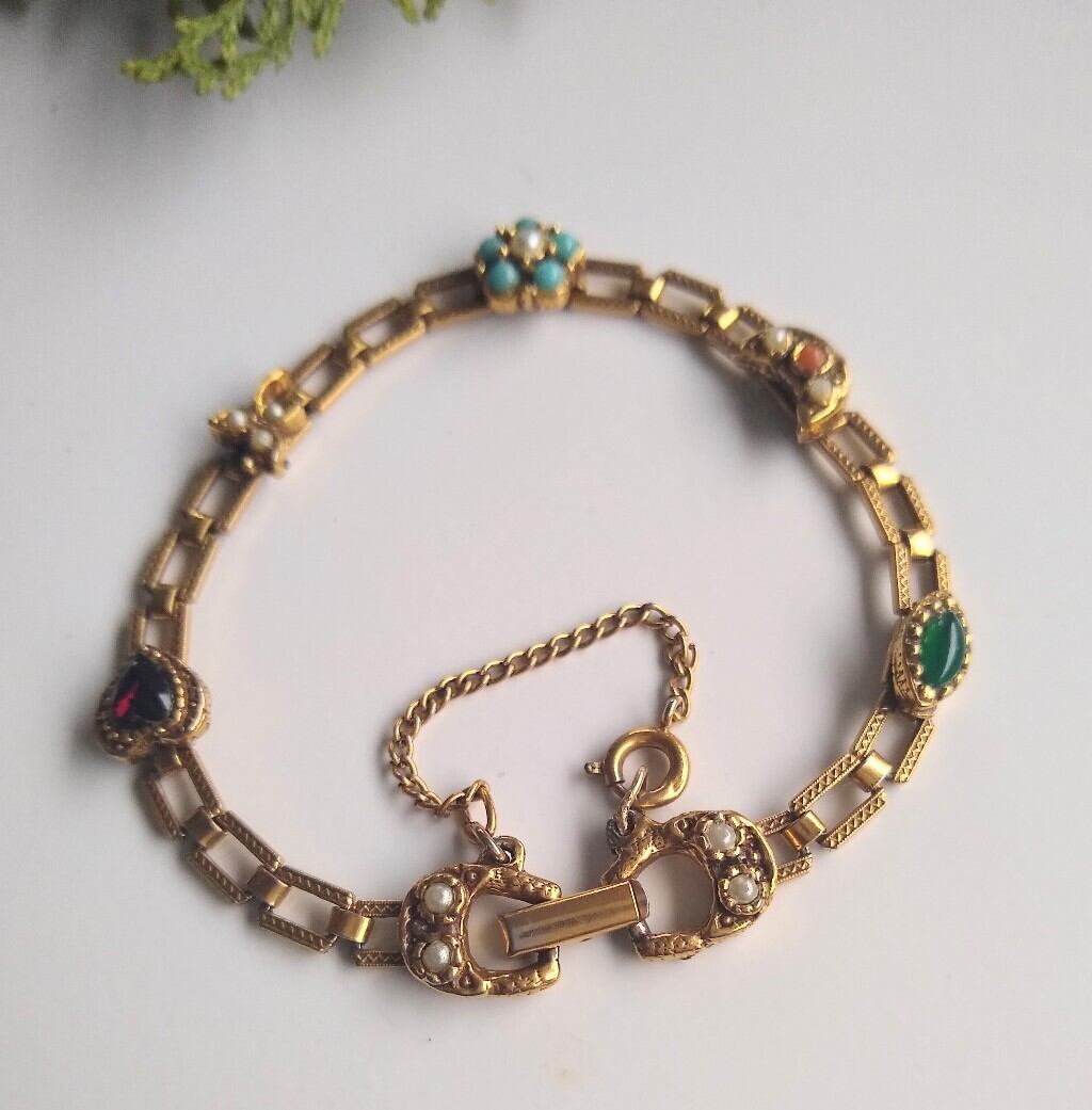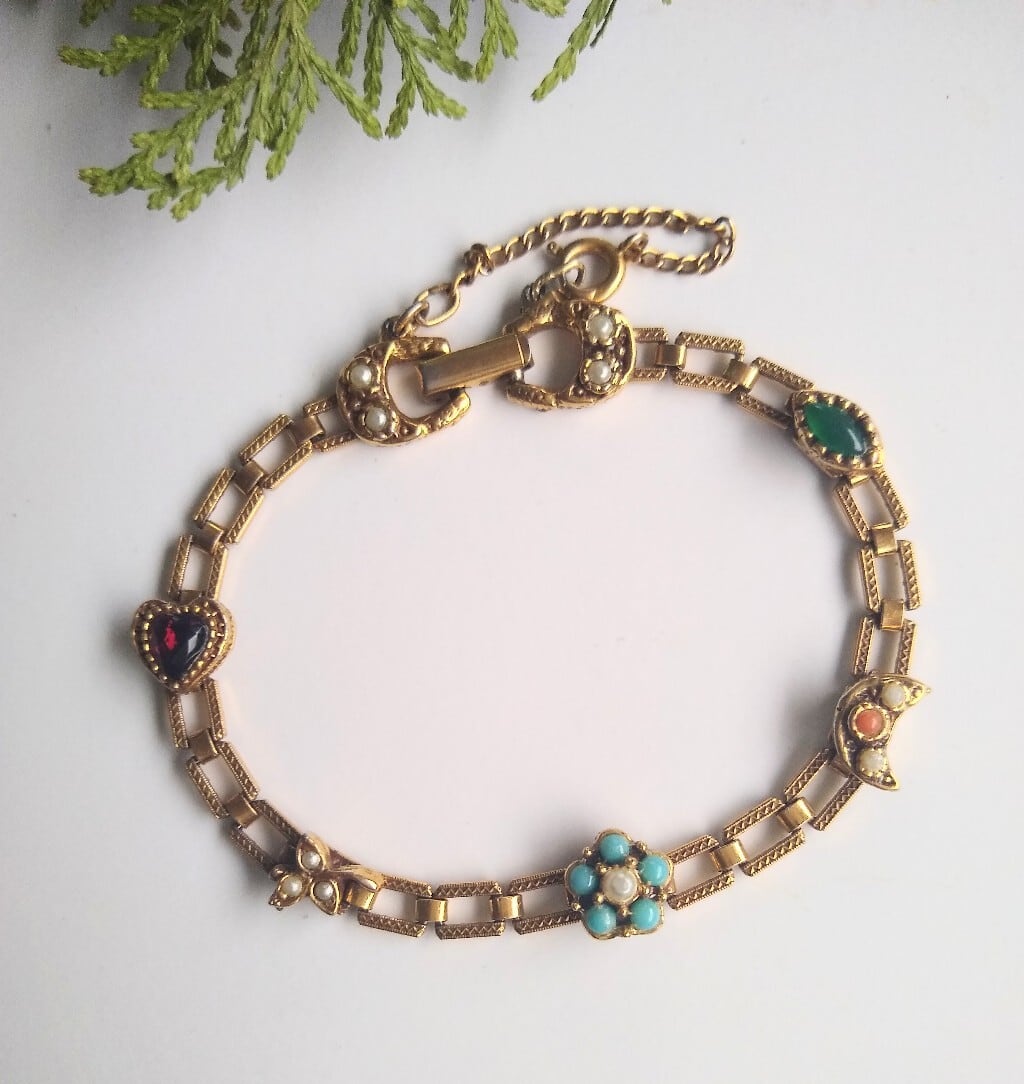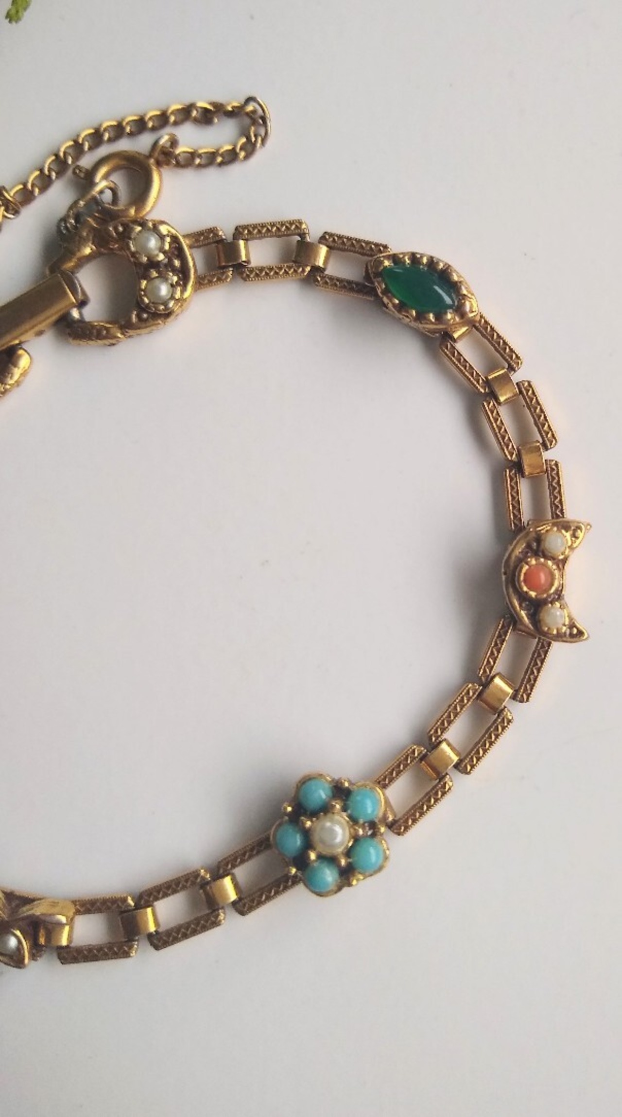 とても繊細な(ほとんどチェーンの様な)ゴールドカラーのメタルリンクを繋げてアンティーク風な5つのチャームを付けた素敵なゴルデットのヴィンテージブレスレット。