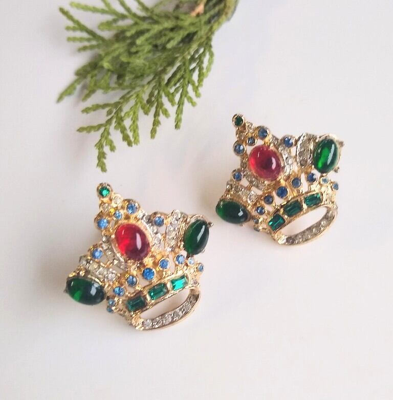 赤とグリーンのカボション、小さなブルー、グリーン、クリアラインストーンがきらきらと輝くCOROの王冠イヤリング。