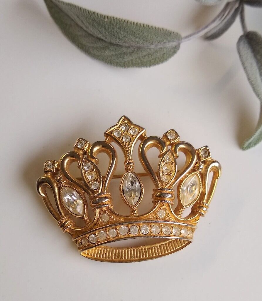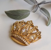 イエローゴールドカラーメタルをベースにラインストンを用いた王冠モチーフのケネスジェイレーンデザインのヴィンテージブローチ。