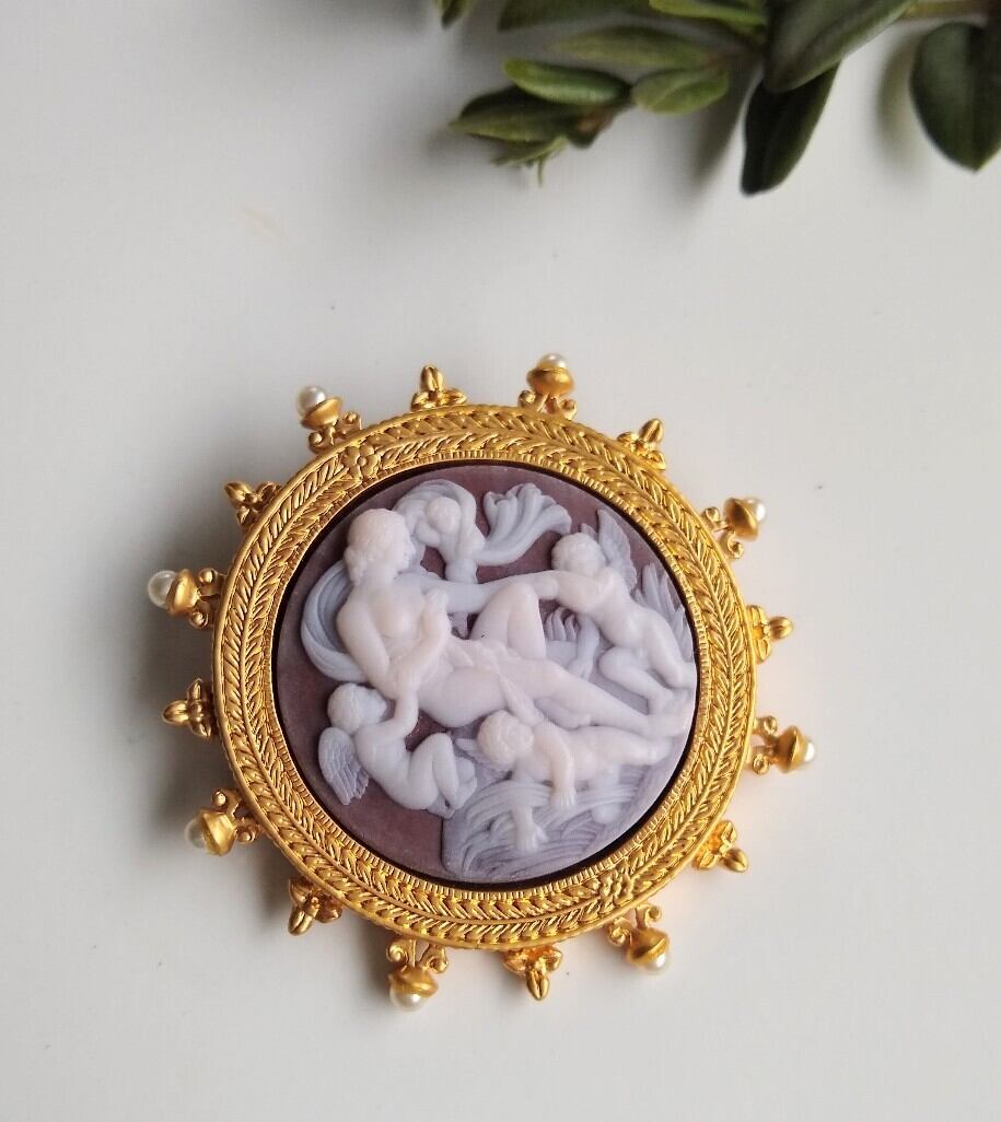 ゴールドカラーメタルをベースにパープルがかったアンバー色をバックに白いカメオ(素材はガラスだと思います)がとても美しいブローチ。女性と4人のキューピットのモチーフがとても素敵です。このブローチ、スミソニアン博物館に置いてある美しいアンティークブローチを元に作られました。