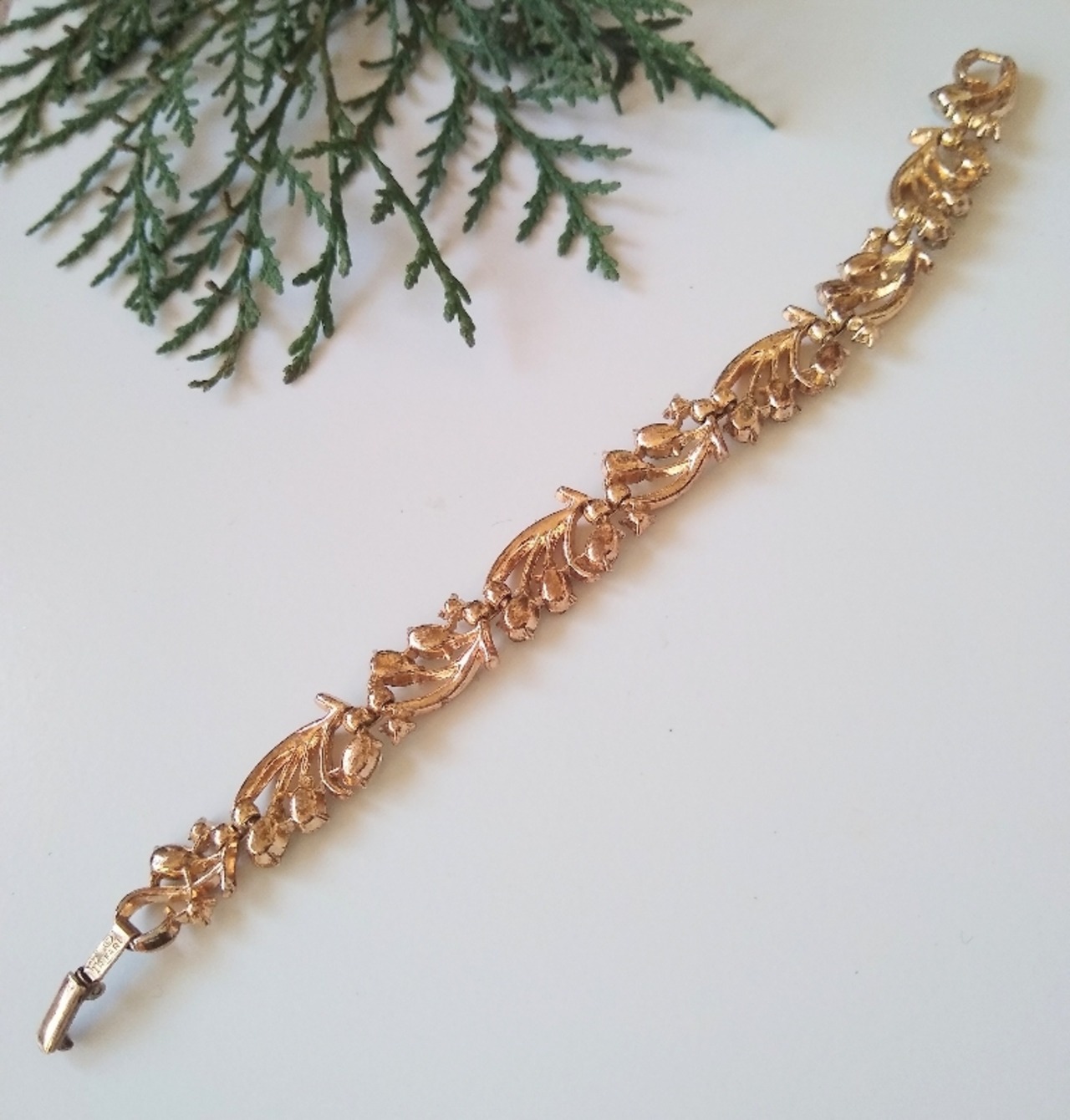 イエローゴールドカラーメタルをベースに、クリアラインストーンをあしらったトリファリのヴィンテージブレスレット。