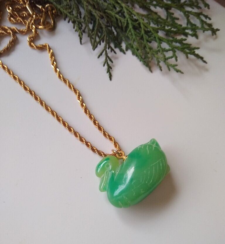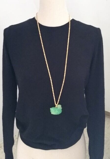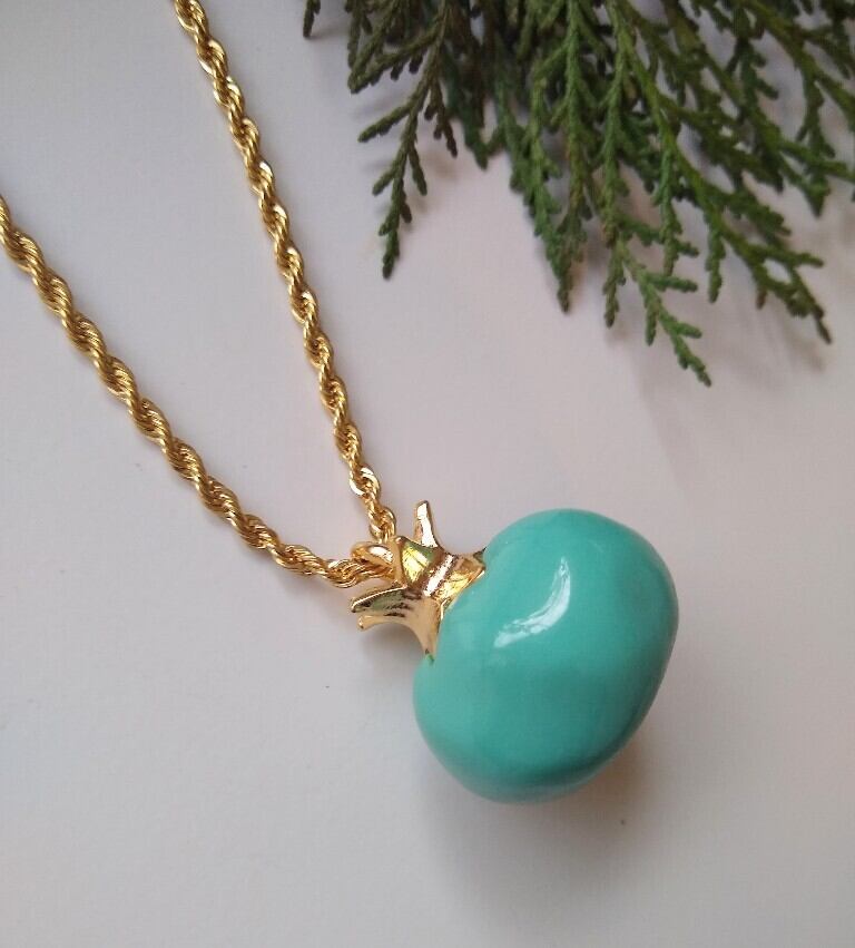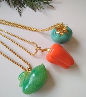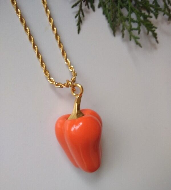 ゴージャスな14Kゴールドフィルドロングチェーンに美しい色の可愛らしいザクロ、ペッパー、アヒルの樹脂製ペンダントが付いたケネスジェイレーンのネックレス。