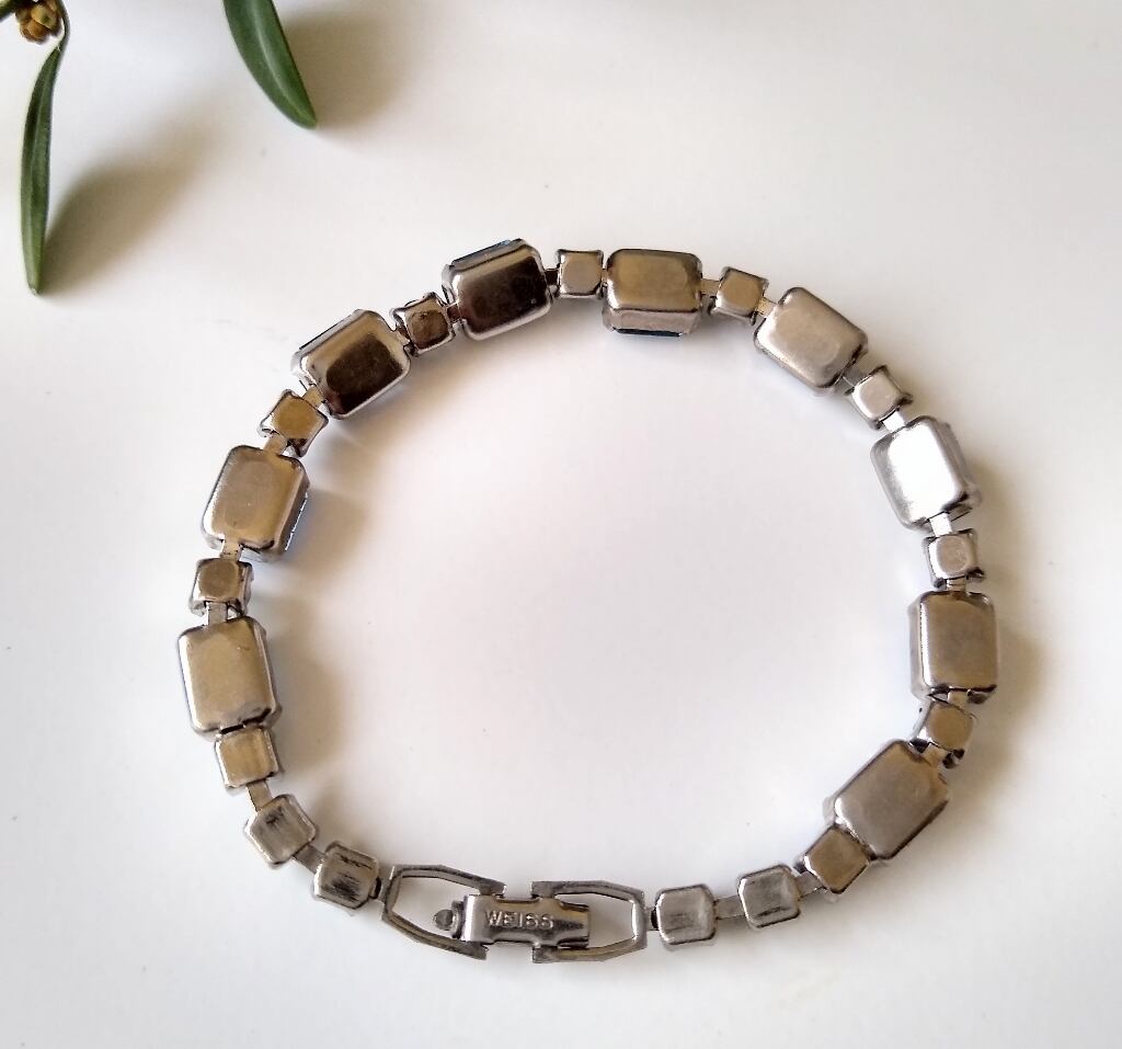 シルバーカラーメタルをベースに淡いブルーのお色の長方形ストーンと虹色に輝くABラインストーンを交互に丁寧に繋げたWEISS刻印のヴィンテージブレスレット。