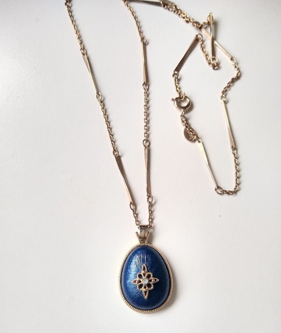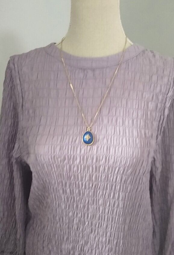 イエローゴールドメタルをベースに卵型のネイビーブルーのペンダントがシック。